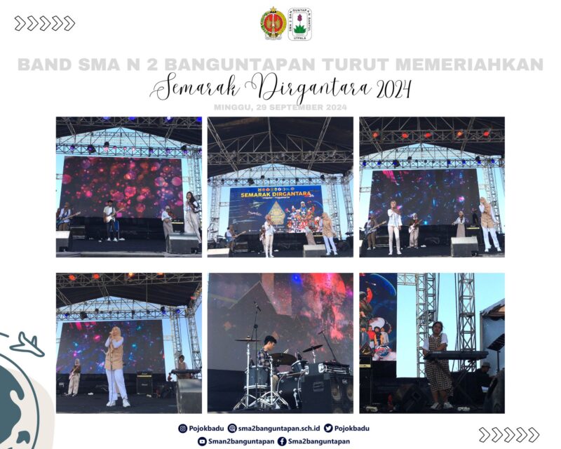 Minggu (29/9) Band SMA Negeri 2 Banguntapan tampil memeriahkan kegiatan Semarak Dirgantara 2024. Semarak Dirgantara merupakan agenda rutin tahunan yang digelar oleh TNI Angkatan Udara. Pada tahun 2024 ini, Daerah Istimewa Yogyakarta (DIY) dipilih sebagai tuan rumah penyelenggaraan Semarak Dirgantara 2024. Rangkaian kegiatan Semarak Dirgantara 2024 diisi dengan demo olahraga, bakti kesehatan, bakti sosial, gathering komunitas, pentas seni, drumband AAU, kirab prajurit bregada, kolaborasi orkestra, seminar nasional, dan pameran UMKM. Pada kesempatan kali ini, Band SMA Negeri 2 Banguntapan ditunjuk sebagai salah satu pengisi acara di kegiatan pentas seni pelajar.
