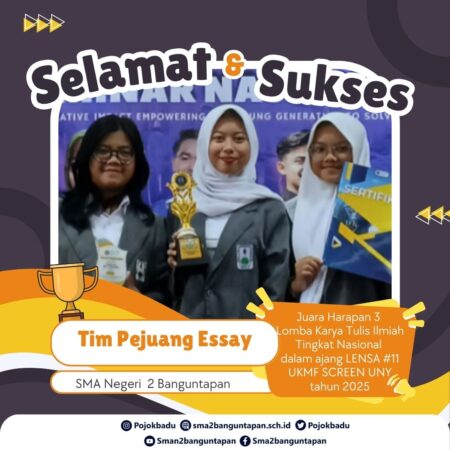 Kabar membanggakan datang dari siswa SMA Negeri 2 Banguntapan yang sukses meraih Juara Harapan 3 dalam Lomba Karya Ilmiah Tingkat Nasional yang diselenggarakan oleh UKMF SCREEN FISIP Universitas Negeri Yogyakarta (UNY).